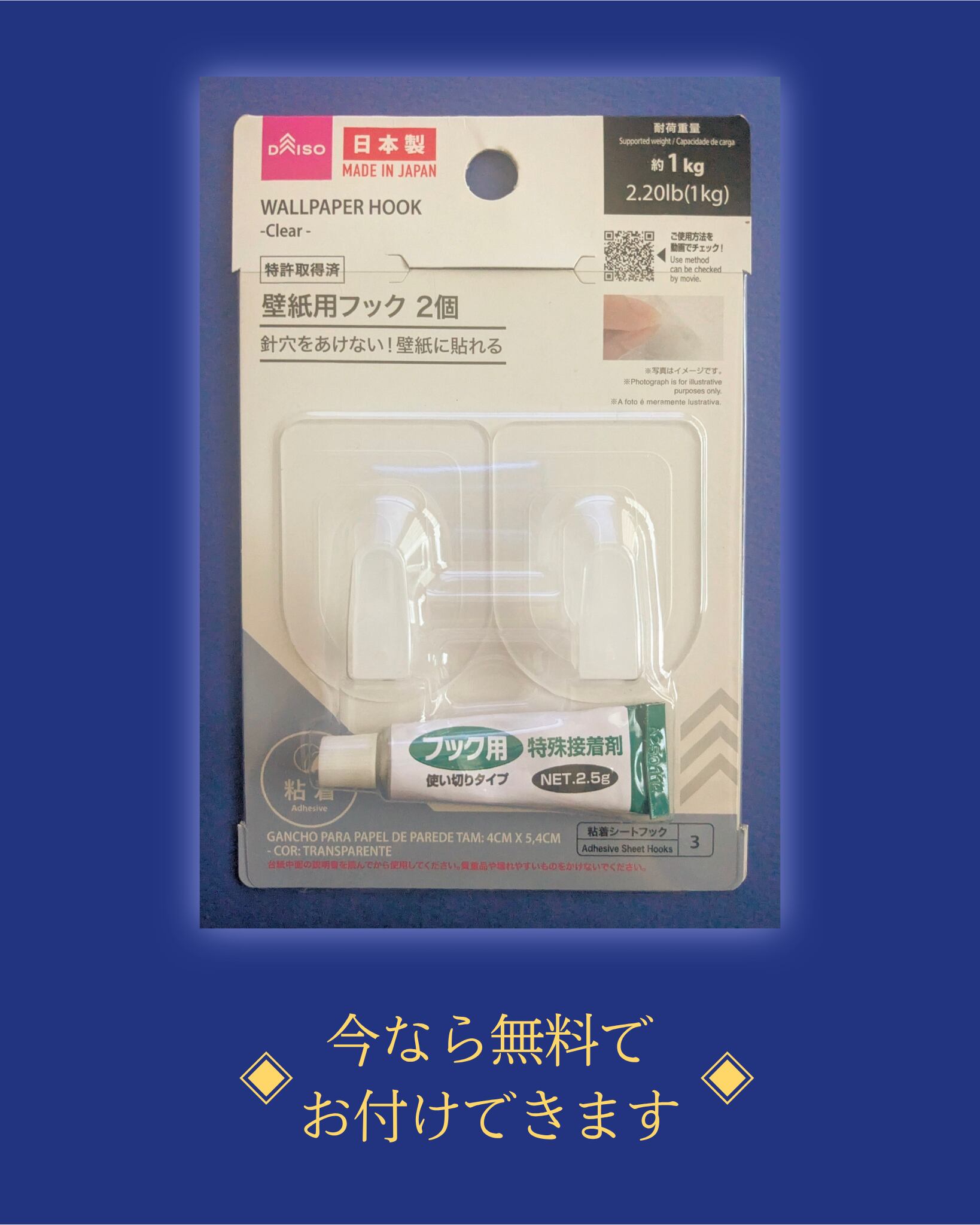 針穴を開けずに付属の特殊接着剤でとりつけられるフックです。
